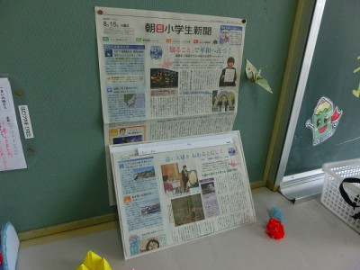 1年生は、コスモスや学級園の様子を絵と文章で表現していました。また、読み聞かせの活動と関連させ、教室の後方には「平和」について考えた子供新聞が掲示されています。