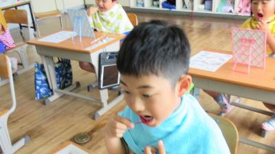 1年生 養護の先生の指導で、歯磨きの仕方を学びました。