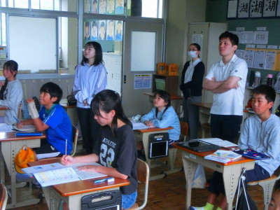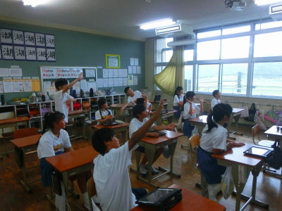 3・4年生は国語の授業でした。デジタル教科書のフラッシュカードを使って漢字の学習を行っており、終わるとみんなで「がんばったね!」のポーズをとっていました。その様子を写真に撮りました。