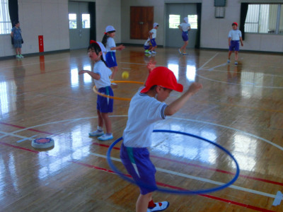 1〜4年生は体育でドッジボールでした。今日も「ボールが当たって外に出る人は2人まで」など特別ルールを取り入れて、先生が個別に点数をつけることで、すべての子どもが参加できるようにしていました。また、学年ごとにボールを投げる位置の線を変えるなど、発達段階に応じた工夫がなされていて、とても素晴らしい取組でした。