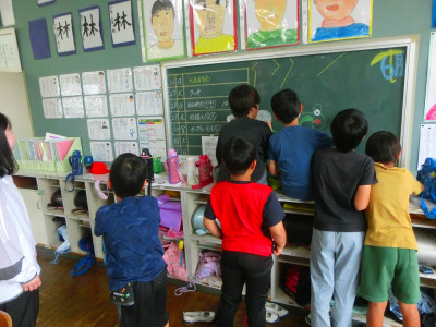 3年生の教室では、黒板に新しい掲示を作成しているところでした。